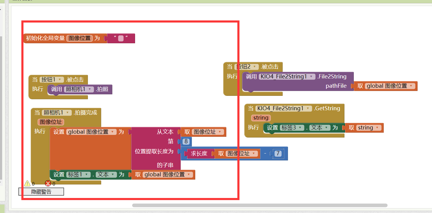 appinventor获取照相机后拍照后的绝对路径的方法 2018年2月20日 1 Comment chenjianle 如果调用照相机拍照后返回的是 file://+绝对路径 那么获取该文件的绝对路径不加file://协议怎么处理呢,当然是用字符串截取,但是这里的字符串截取的起点是1,居然不是从0开始算起,所以file://中的f代表的是1 具体代码块如下: 那么这样截取出来的就是绝对路径了,因为我要进行base64编码,只能这样,把这个图片的绝对路径保存到一个全局变量中然后再调用