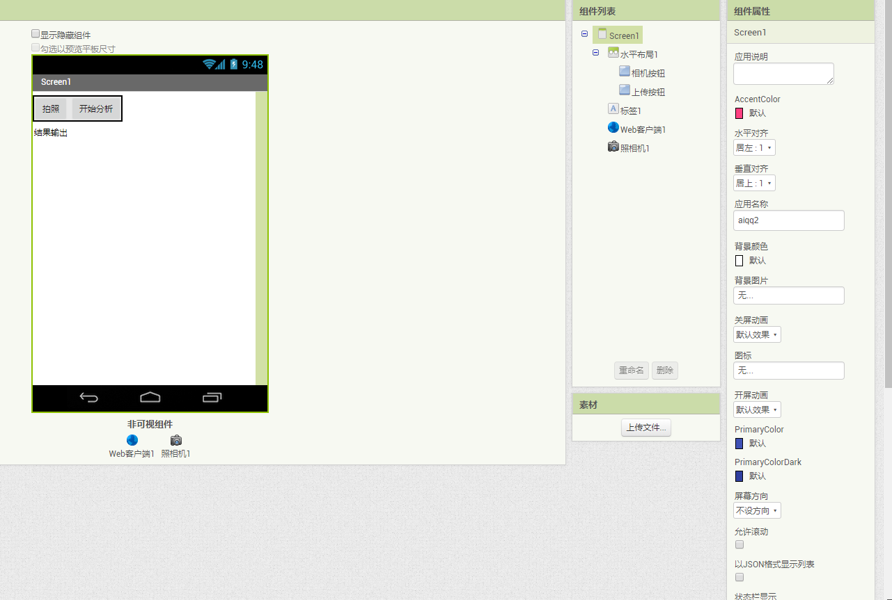 本次教程主要使用appinventor编写手机端,主要功能:拍摄和上传图片,结果展示。